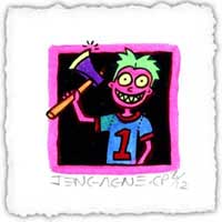 Boy with an Axe: 2 by 2 inch original fluorescent pop art paintings, by Jen GagneEach of the 12 limited edition "siblings" is colored differently, then ripped into twelve separate 2x2 pieces. You can see more in the mini gallery.